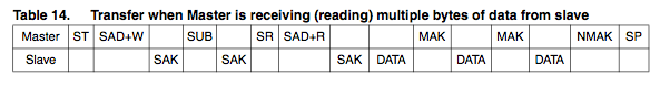 This is for reading more than one byte from the slave. Note that the “master” (my microcontroller) sends an Master Acknowledge (MAK) after the first bit of data. Well, I found that for some reason, the first bit of data is always just the address that you sent it. The second piece, however, is what you really want.